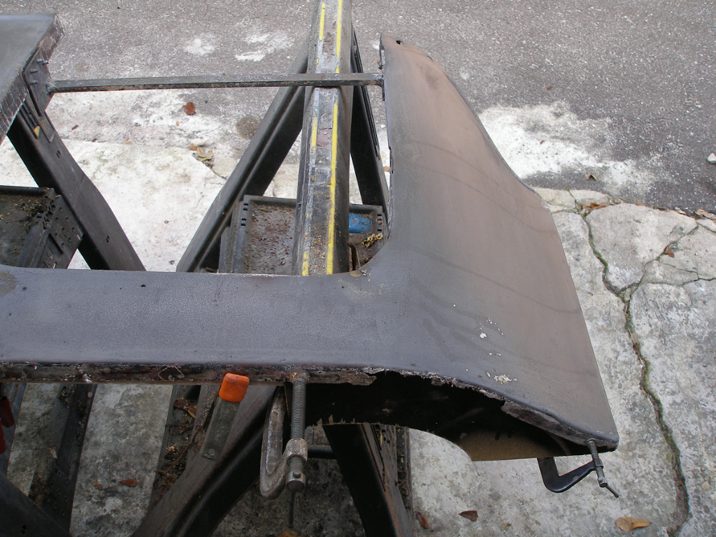 - New steel panels are useful but rarely fit without alteration. I returned the new panels I bought and fabricated patches for everything as I felt the new panels would need at least that much work to fit. I did relent and buy the "correct" dust aprons which are very nice but have a crease from the firewall to the front which are entirely wrong and after many hours agonizing believe that they will look better left alone than reworked. Another case of "almost perfect". At least they saved me days and days of welding to salvage the old ones and at some point, being done has more value than being authentic so long as I'm not building a Stynoski Car, I'm fine with that.