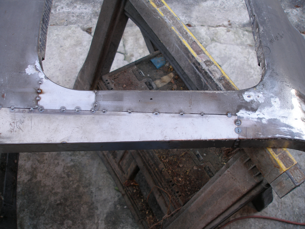 Matching backing plates were made so that the machine screws clamped the sheet metal and the panel became VERY rigid and was much easier to handle and repair. You can see from the extent of the repairs, the panel could never have kept shape without it.