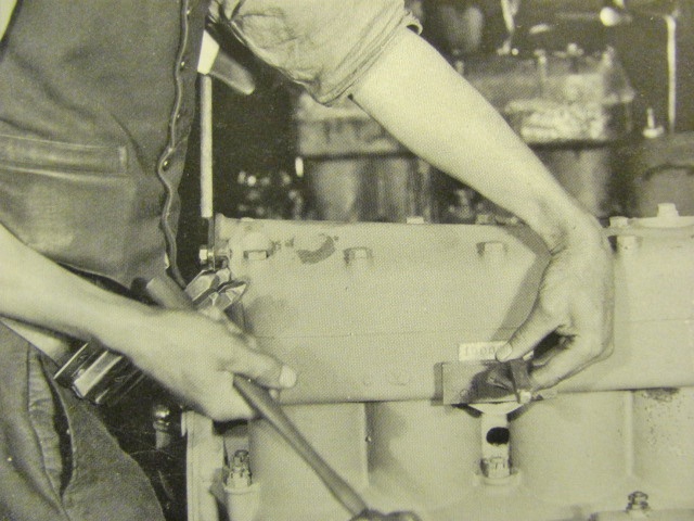 Perhaps Ford used a gang tool. But this photo from 1927 shows a belt holster with large punches, and a plate stuck to the lower side of the water inlet, the plate acting as a guide to locate the large square shaft of each numeral punch. That guide assisting in helping the numbers be in a neat row too.
