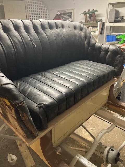 I would weld/bolt/rivet a "foot" to the base of each of those original brackets and use those to attach the seat to the base. In other words, just replace what someone has "scalped" off in the past.ivaldes1 wrote: ↑Mon Aug 02, 2021 9:55 pmThanks, I have an upholsterer who removed the original cover and is going to make a new one. However, the seat body is back to me for continued refurbishment and painting, toothpick the tack holes, repair the damaged or missing wood, fill holes. Here is the interior of the mystery seat. I am wondering if I can or should change out the existing mystery top body brackets for known Ford top body brackets. The 2 front body brackets have been scalped at the base. The 2 rear ones are intact. Not seeing anything on Lang's that would do the job. I have 2 weeks to figure that part out.