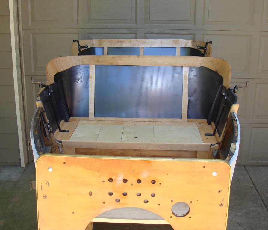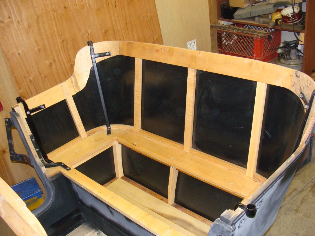 The black that you see is the painted surface of the inside of the sheet metal. It was painted (along with all the body irons) before the woodwork of the backrest was done. The outside of the sheet metal was left in grey primer, which I re-painted with black primer, before painting the car with midnight blue.