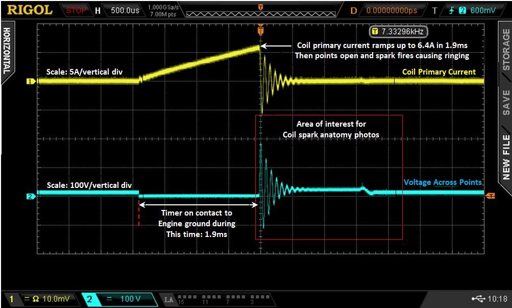 For Context, here is another oscilloscope screen shot illustrating the relationship between coil primary current (Yellow trace this time) and voltage measured across the coil points (Blue trace this time). The Red box illustrates the area of focus in the previous screen shots.
