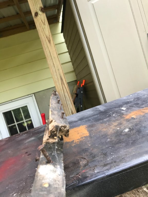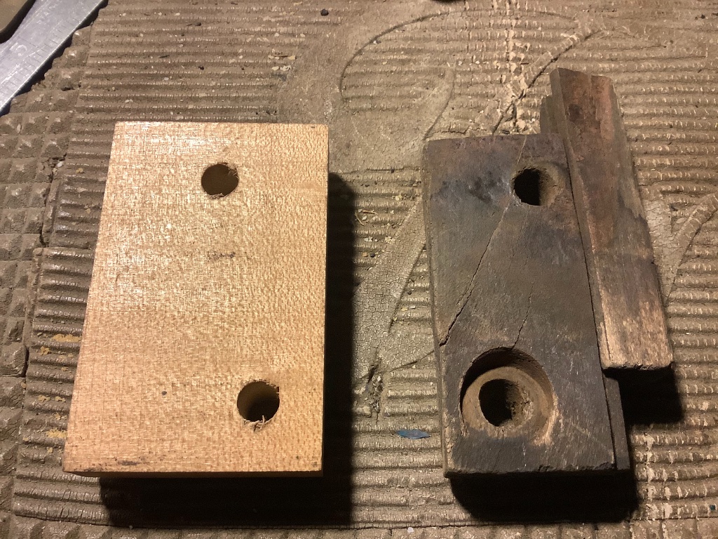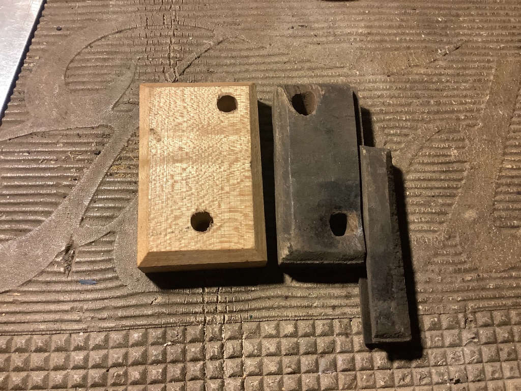 Here is a small ford wood part with the linderman joint. You can see why they haven’t been seen much from this specimen. My speculation that wood boards were made from scrap, and machined into smaller parts. Too small for this operation , it was charcoal time, baby. Note the angled, counterbore hole on the original jointed hood block. Two different hole diameters, also.
