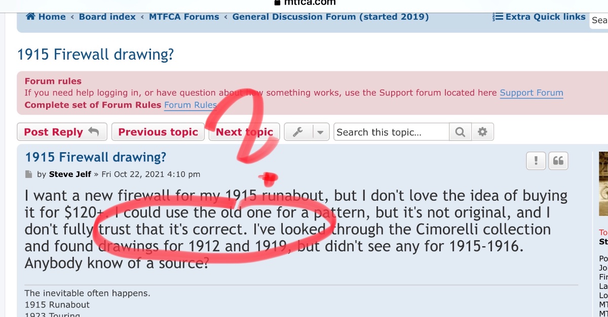 I want a new firewall for my 1915 runabout, but I don't love the idea of buying it for $120+. I could use the old one for a pattern, but it's not original, and I don't fully trust that it's correct. I've looked through the Cimorelli collection and found drawings for 1912 and 1919, but didn't see any for 1915-1916. Anybody know of a source?