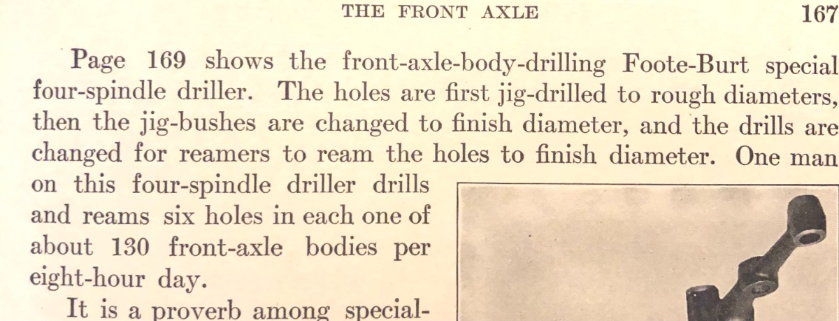 Yes, automated process to control drill hole locations on the axle for the perch and spindle holes. Tight tolerances. Holes were drilled rough then reamed to precision size. Would be very odd to have an axle drilled poorly. This is from 1915, so you know better machines were later in place.TXGOAT2 wrote: ↑Fri Sep 03, 2021 7:11 pmI'd think they'd have used some kind of gang drill arrangement. Ford invested in a lot of specialized equipment. Maybe a bit broke or spun in the chuck, and this axle was rejected and diverted to a repair station where it was hand drilled or put in a drill press, then put back on the line or sold as a replacement part.
