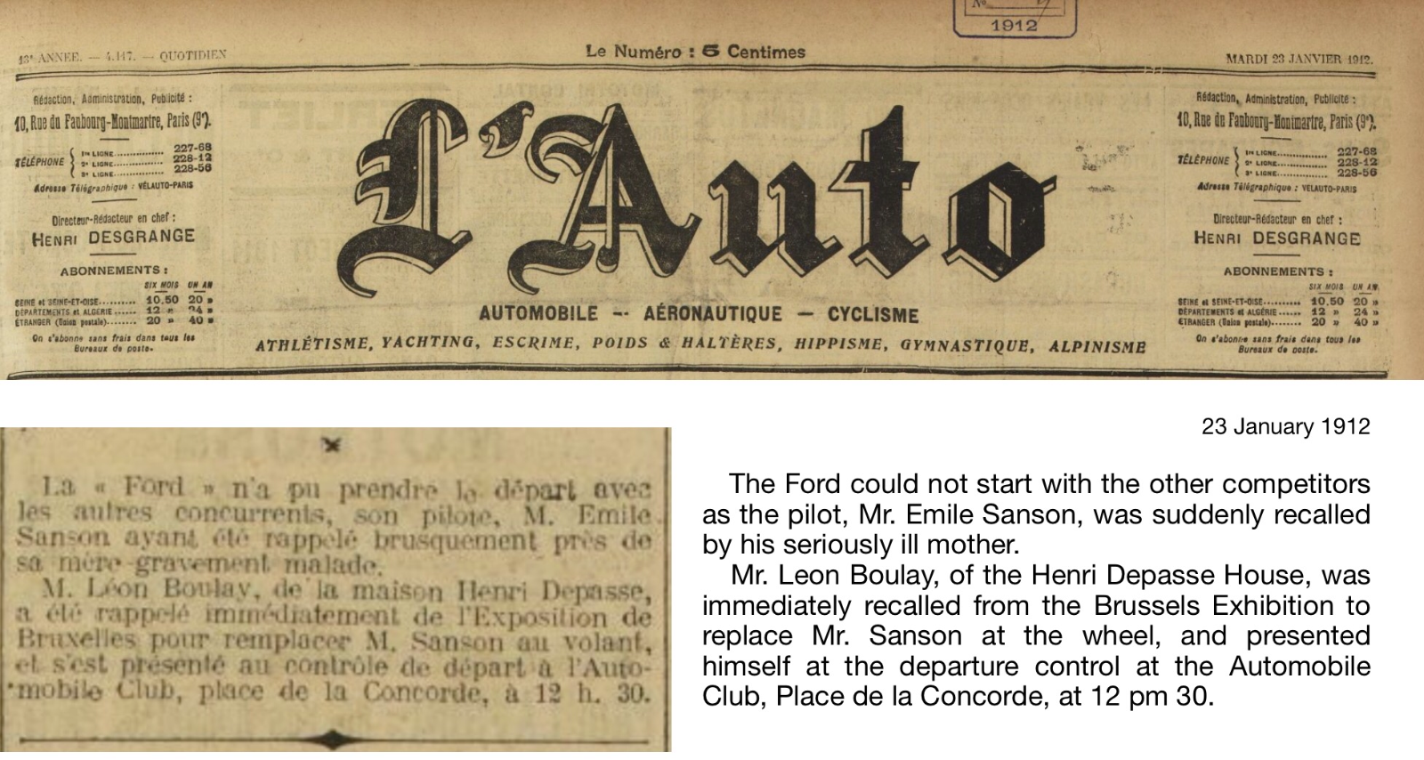 Unfortunately, of the 27 cars listed starting from Paris, Henri Depasse's Ford didn't make the start.
