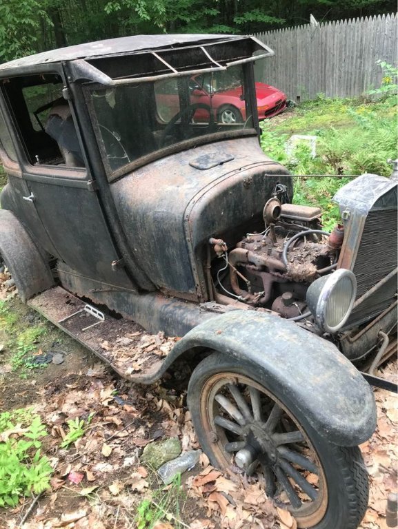 Definitely needs a new splash apron on the running board--I'm sure that everything that could go wrong has--but there's no way this T has sat out for 100 years; it looks like it was a nicer car that got put outdoors a few decades ago & went to the bad.