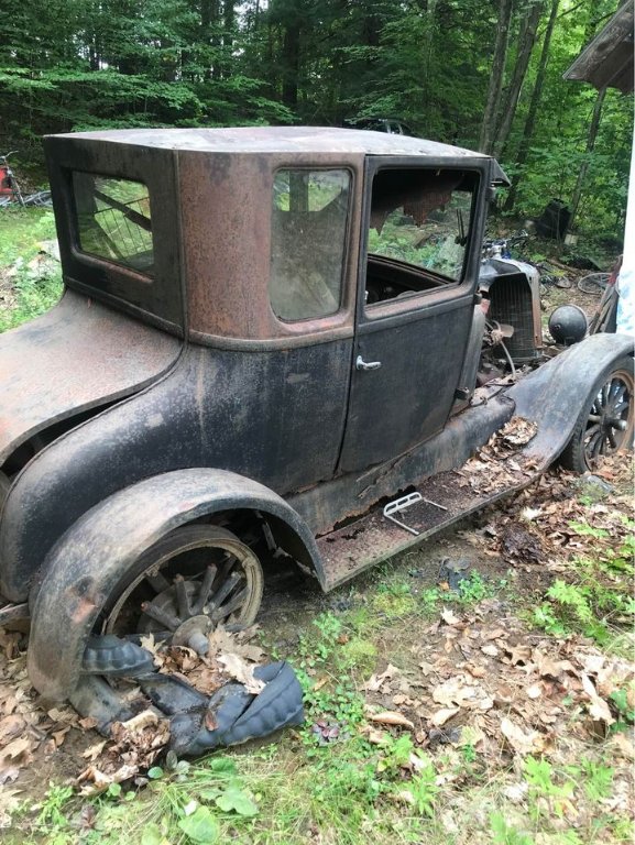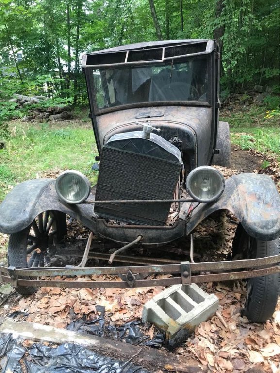 Somehow it has escaped the glass breakers and copper thieves. A lot of it is straight and rust free. It looks like it could be an original build. It looks like it has suffered mostly from exposure, rather than long, hard use. I'd like to see if the block shows freeze cracks. The engine still has plugs in it, so it may not be hopelessly siezed, and the gas tank looks to be covered. There may be a lot there, especially if the serious visible rust is from leaves piled on the running board rather than the curse of road salt. The lower body doesn't look too bad, and the doors still have their lower edges. Doesn't look like the chassis has been sunk in the dirt. Odd that it appears to still have a top on it.
