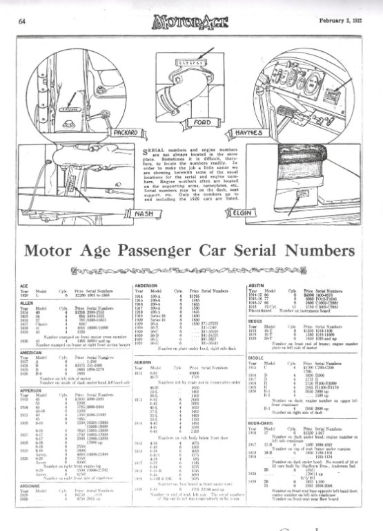 Motor Age for 1922 presented an article that included passenger car serial number from 1913 to 1920, cars from the ACE to the Winther. The purpose of the article was assist insurance companies in the recovery of stolen cars and a discussion for standard numbering of automobile motor and chassis numbers.
