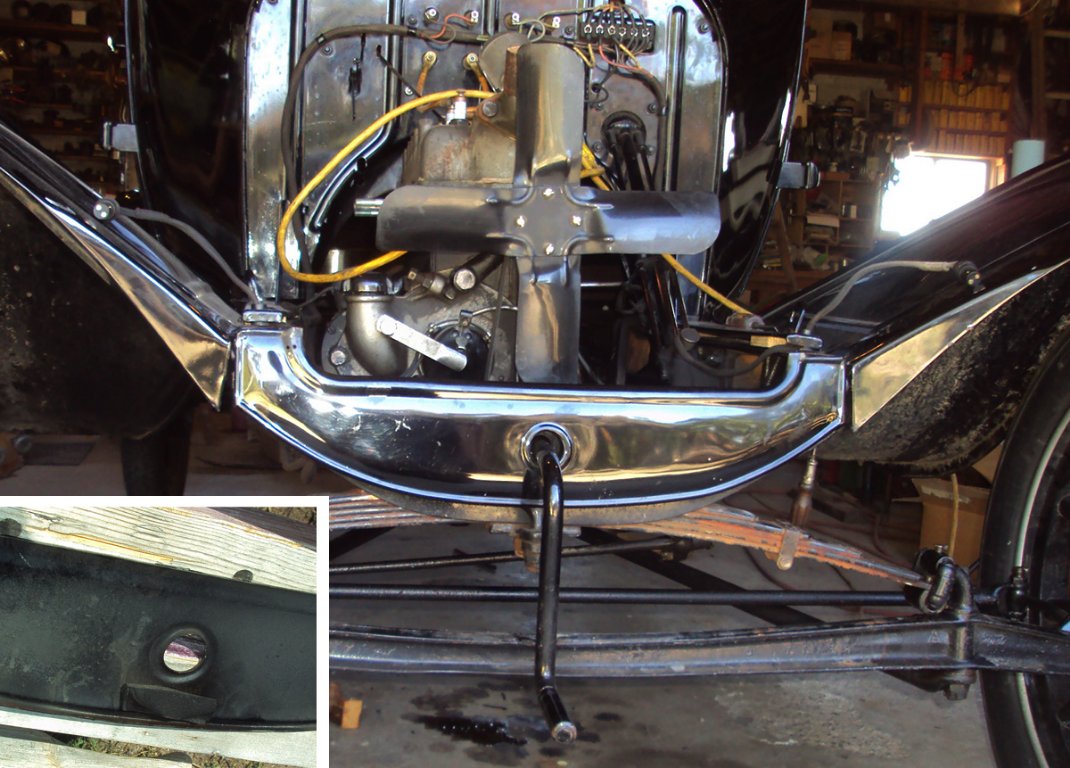 Henrietta, my 1925 Canadian car, has its original apron still in place. Not only is it held captive by the radiator studs, it has folded edges that are sandwiched between the frame and the fender iron. To get it off I imagine is a major operation. Radiator off first. Then the radiator studs would need to be removed to get access to the fender iron bolts. I imagine all three of them would have to be loosened, after you get the cotter pins out, and the front one removed so the apron could be slid forward. I can well understand why the side folds were deleted, and why many slot the radiator bolt holes in the top fold. At least on the 26-7 aprons the screw below the crank handle will still hold the thing in place.