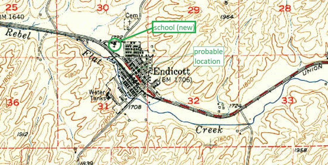 Here is the surviving building on the West side of 3rd Street. The building in the background looks like it could have been a school but the school is now just the Endicott Elementary school on E Street to the North-West. The USGS 1950 topographical map shows that the school moved by then.