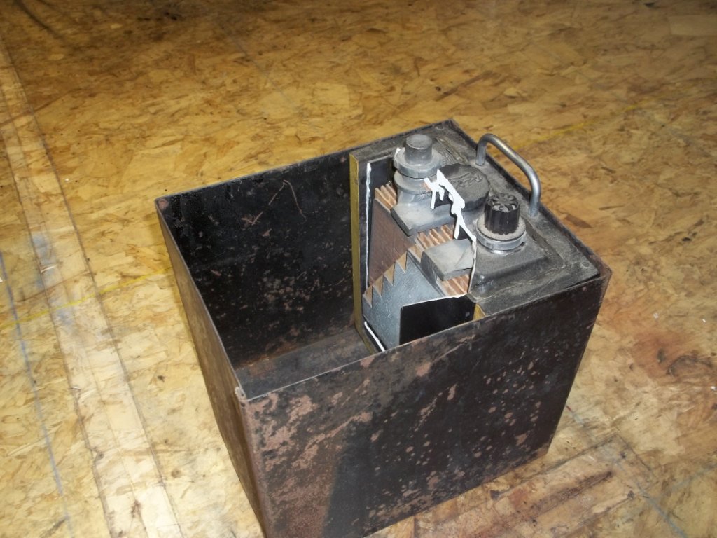 Here are a few photos of a NOS, original, 1926-27 battery box and lid. The "cut-away" battery is an original dealer's display with a wood box showing one cell. The dimensions of the steel box are 9" long by 7 1/8" wide by 8" tall. As you can see, the cut-away battery fits perfectly into the steel battery box. It appears the cut-away battery box is made from oak. It is my belief that all Model T's came with a steel battery box from 1919 thru 1927. I hope this helps, Russ Furstnow