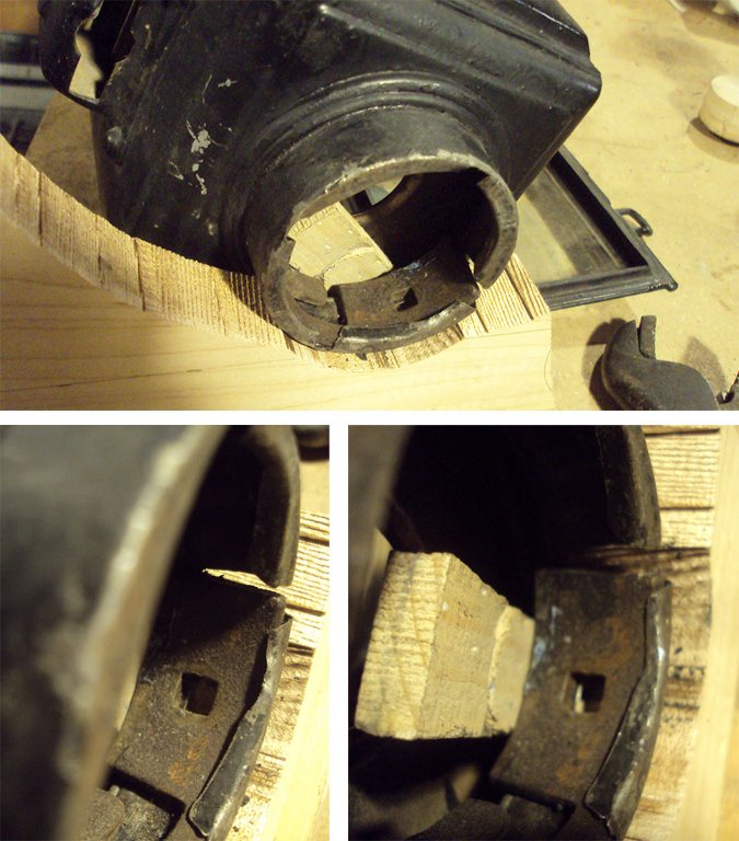 I wanted to reassemble this one that had the font forcibly removed without lining the 4 tabs up. The hole was no longer round. I cut some maple to fit the curve of the base for the font. Then by using the curved latch plate as a form I could hammer the lip back into shape.