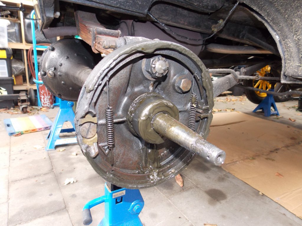 Due to the play on the shafts and the grey color of the rear axle oil, I will take the rear axle apart for a total rebuild. Not cheap but the only way to do it right and keep the oil and grease off the brakes and leaking on the wheels.
