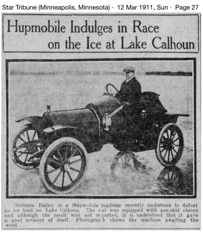 Below, in 1911 a Hupmobile races an Ice boat in Minnesota: