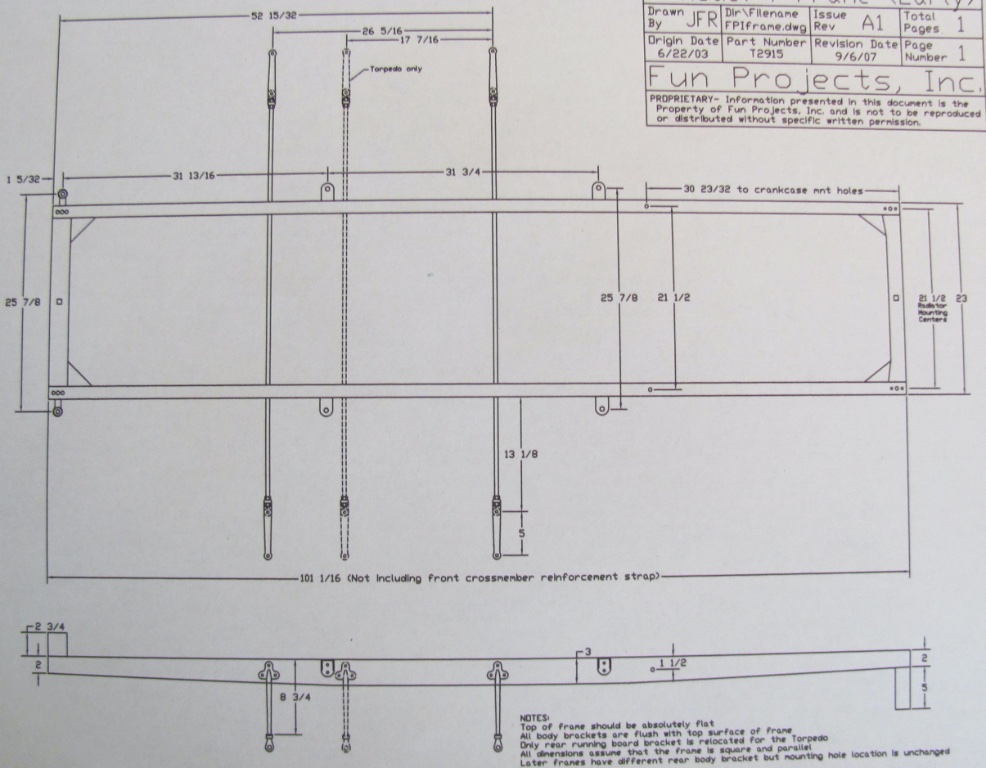 The factory drawing dimensions captured in this sketch shows the frame brackets to hold the body support brackets are to be 25 7/8" apart.