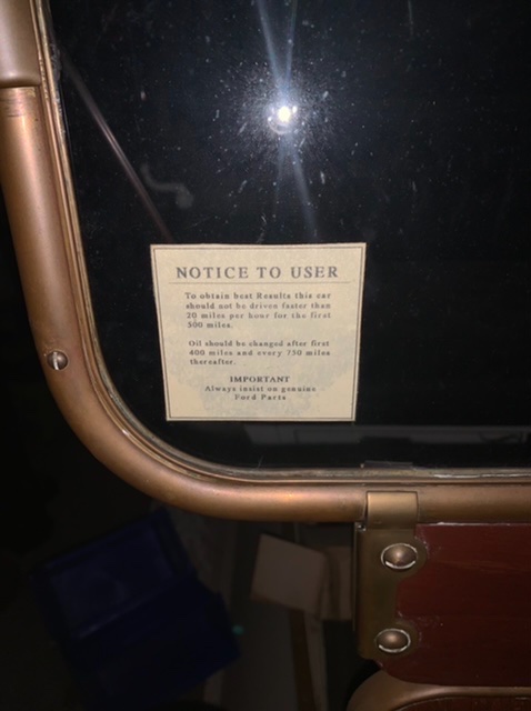 For almost 50 years, I have known of a 1926 coupe that has a well worn sticker on the bottom left corner of the windshield. From what I recall, it was a notice to the customer about break in speed for the first 500 miles, general care, tire size, etc. The car has never been apart; it may have been “brushed-up” in the 1950s or 1960s. My question is: could the sticker be original to the car from the dealer or a mid-twentieth century addition?