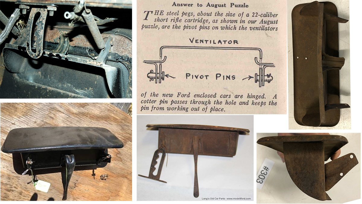 As for the cowl vent, it is difficult to photograph or visualize. I think there is enough her to understand it. The upper left photo is looking up with the ratchet plate and springs mounted on the dashboard. The vent handle is broken off in this one as often happens. This is the '24-'25 closed car version.