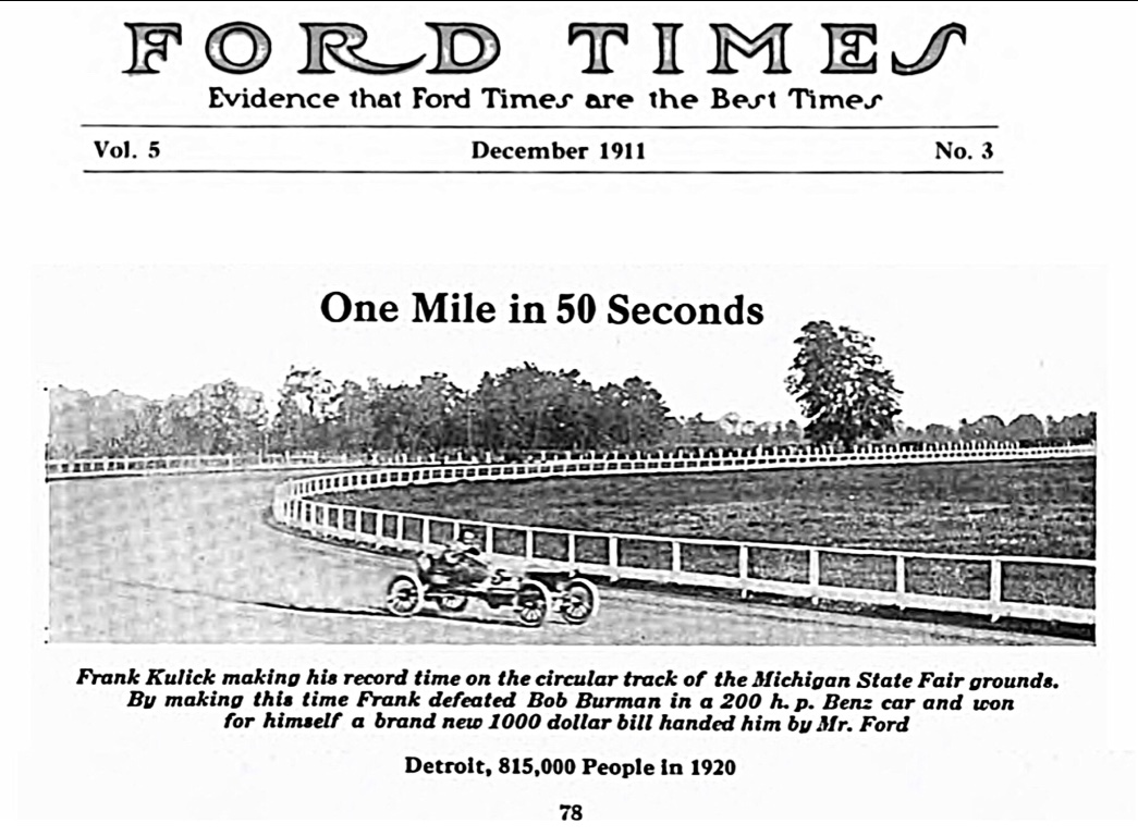 Arguably Fords greatest racing event may be the late September races held at the Michigan State Fairgrounds in 1911. The photo below is one of only two I've found of the Ford 231-300 cu. in. racer (the motor we own). In it, Jaggersburger driving his Case is in hot pursuit. Kulick won both five mile events that day, driving his 228 cu. in. and 300 cu. in. racers. These wins were overshadowed by his win with the largest Ford Special (410 c.i.) beating the Blitzen Benz in a timed match race: