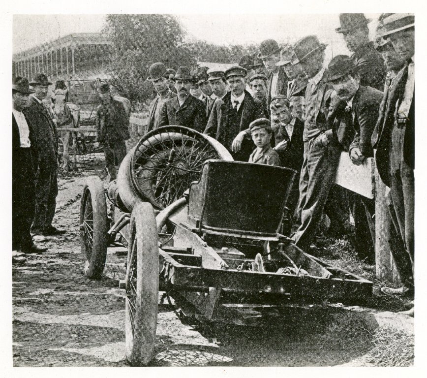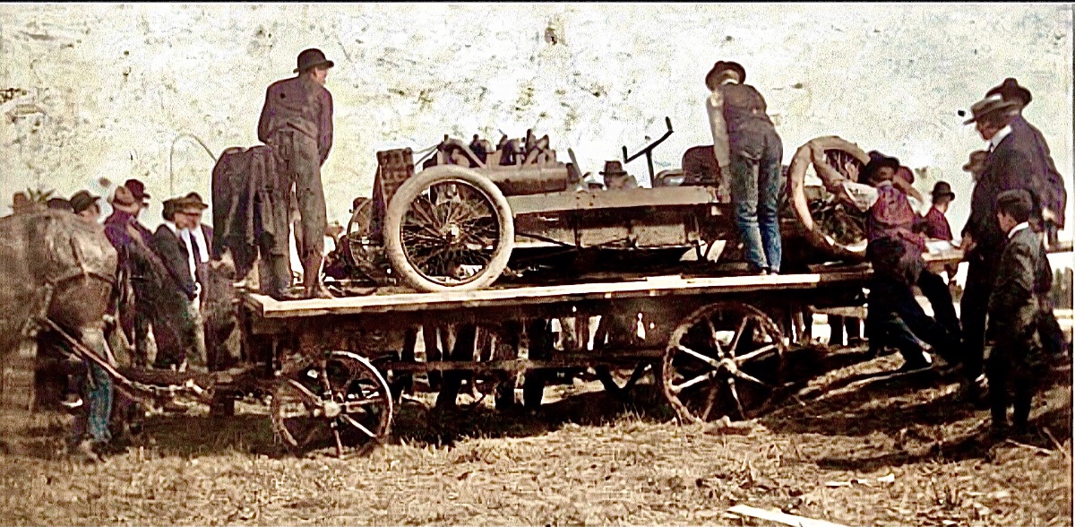 Yes, it's Arrow (999's mate) after wrecking at the Milwaukee Fairgrounds in the fall of 1903. Frank Day, driving, was inexperienced and died while racing 999 driven by Ed Huff. Tom Cooper, who owned both racers, was away at the time. Cooper sent the racer to Henry Ford in Detroit, who rebuilt the it and set the world one mile speed record in early 1904 on Lake St. Clair. Another pic of the wrecked racer as it's being loaded: