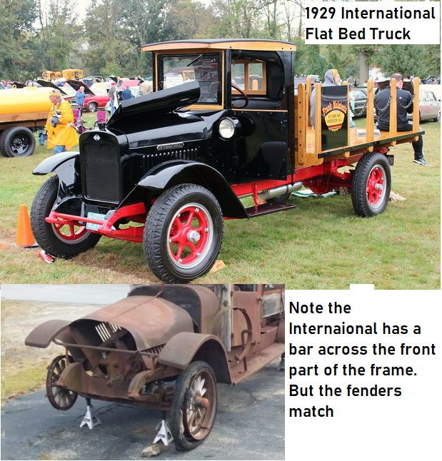 I believe this is a "composite" vehicle, So far I have a good match to parts of a 1930 Dodge Truck and as noted a 1928 International. In looking at various Trucks of the era I did not see any that had a running board from front to rear fender except for Fire Trucks