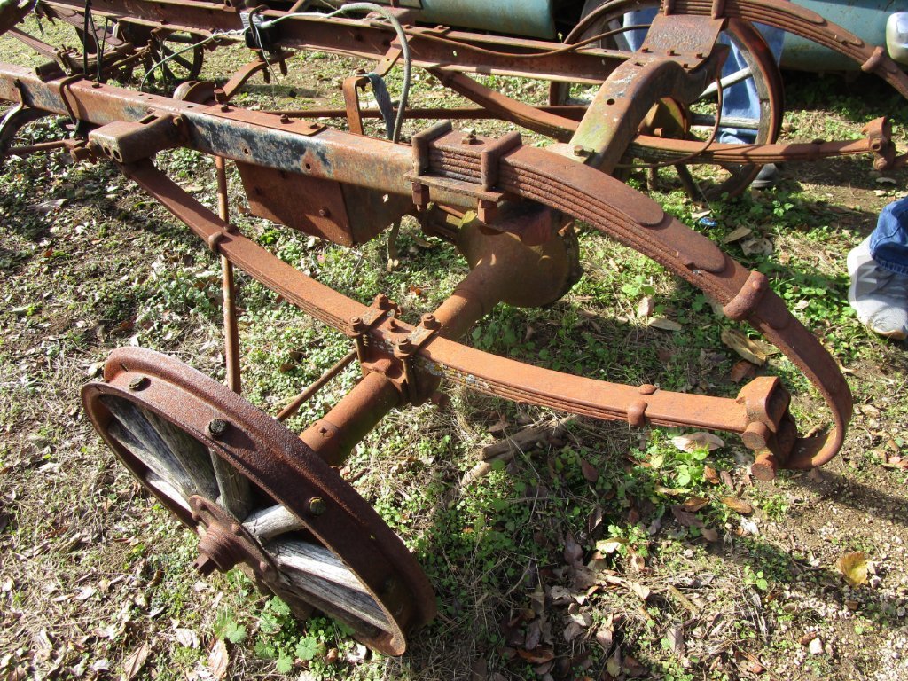 The front axle is most likely either Chevrolet or Overland. Both used front axles similar to that, and are fairly common. I know that some Chevrolet spindles did have a treaded boss for grease/oil fittings on them like that. However, in other ways, it does not look quite like any of the several early 1920s Chevrolet front axles I have been up close with. For that reason (flimsy as it may be?), I would guess maybe Overland. There are other possibilities, but offhand I cannot think of them.