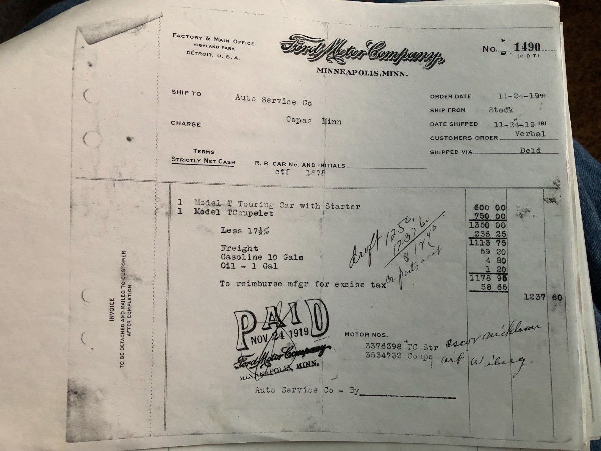 I have a friend who has approximately 20 invoices of T's sold through Auto Service Company of Copas, MN. He allowed me to make copies. Hopefully someone will have one of these cars. Most all list the name of the original purchaser of the cars. Some invoices have two or three cars listed on them. Here is a picture of one of the invoices. Here are the serial numbers of the invoices I have: