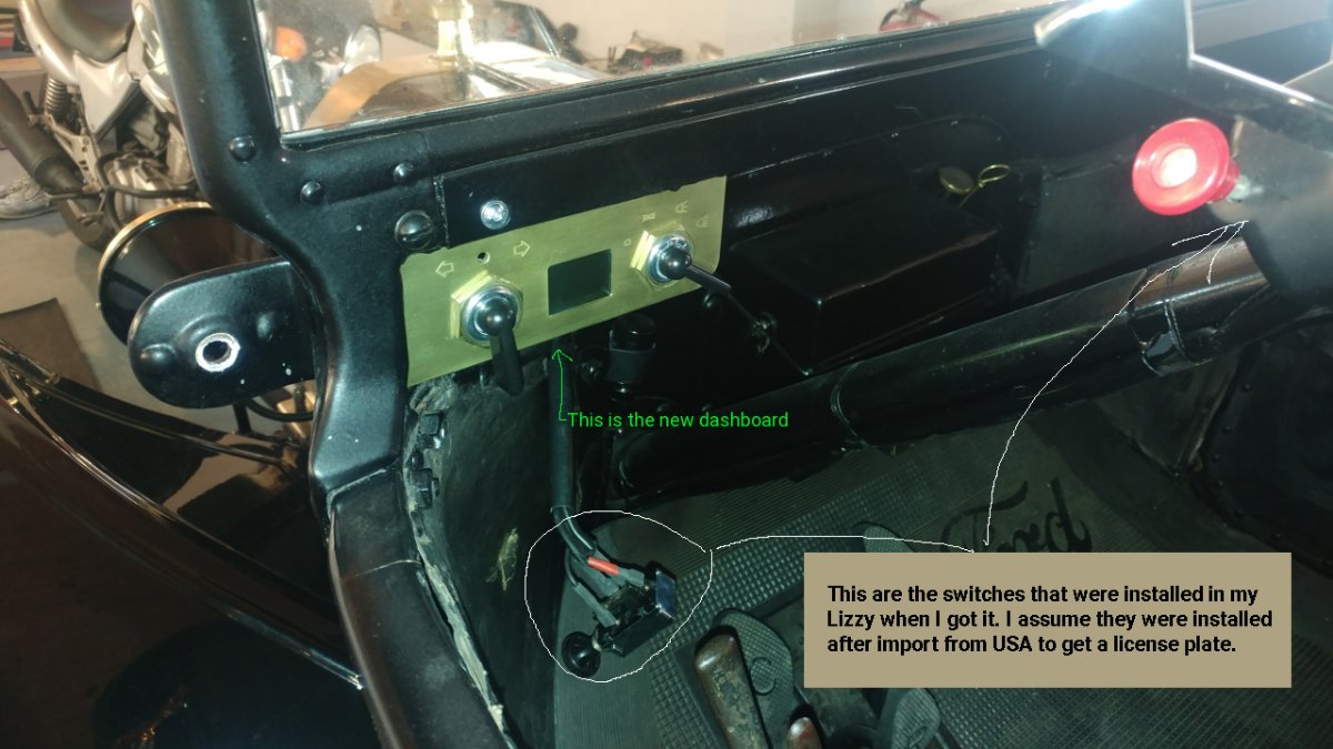 This is a picture taken at the very beginning of my restoration work, therefore the rest of my Lizzy is still very unfinished. But I think this shows better where my cables are running. The wires from dashboard run along the wooden body (inside the black protection tube) down to closely above the flange of the steering column. There they cross the firewall, and end in an old looking fuses-box with six Torpedo Fuses. From there the cable trunk goes down till 2" above the starter. There I made two additional holes through the firewall. The reason is simple - keep cables away from engine so the engine can be pulled without complications.