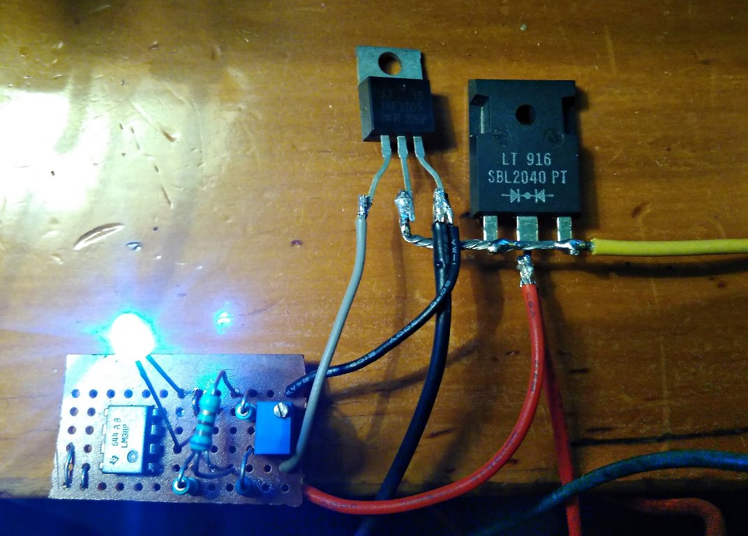 Where it's at presently is that I've made up a breadboard circuit and have been experimenting with different configurations of it switching the gate input of an IRF3205 in shunt across the output of a bench PSU, via a 50W bulb. At this stage I'm pleased with the way it appears to operate, it regulates well within a 100-150mV range and it's stable in operation. Moreover it neatly drops out completely if the input voltage falls below about 6.2V.