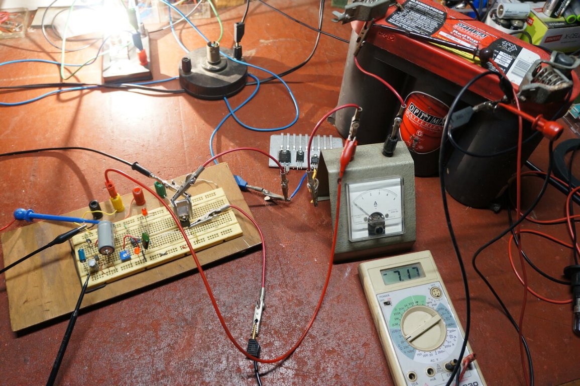 The two photos show firstly a trace from the 494 output to the 3205 gate while it's regulating, and secondly the (rather messy) setup on the bench. To the left is the PSU, the breadboard is in the middle (with both JohnH's comparator and this PWM circuit installed), and to the right is a 6V battery made up of a couple of large LifePO4 cells. The meters are showing battery and [regulated] 'generator' voltage.
