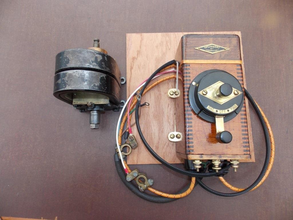 From the pictures, it looks like you have the correct Splitdorf Model G low tension magneto and its associated coil box to return the ignition system to original. The car would have had four large dry cells for starting, then the user switched over to the magneto for running.