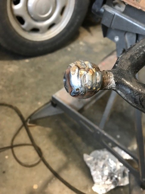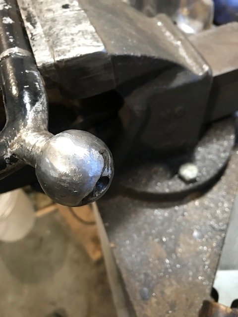 I had a lot of slop in my wishbone ball. I took it out today and it wasn't really very round. I measured the new ball cap and it seemed to be 1.25" diameter so I machined a washer with a 1.25" hole, welded up the ball and filed it to fit. Not perfect, but it has no play in the socket now.
