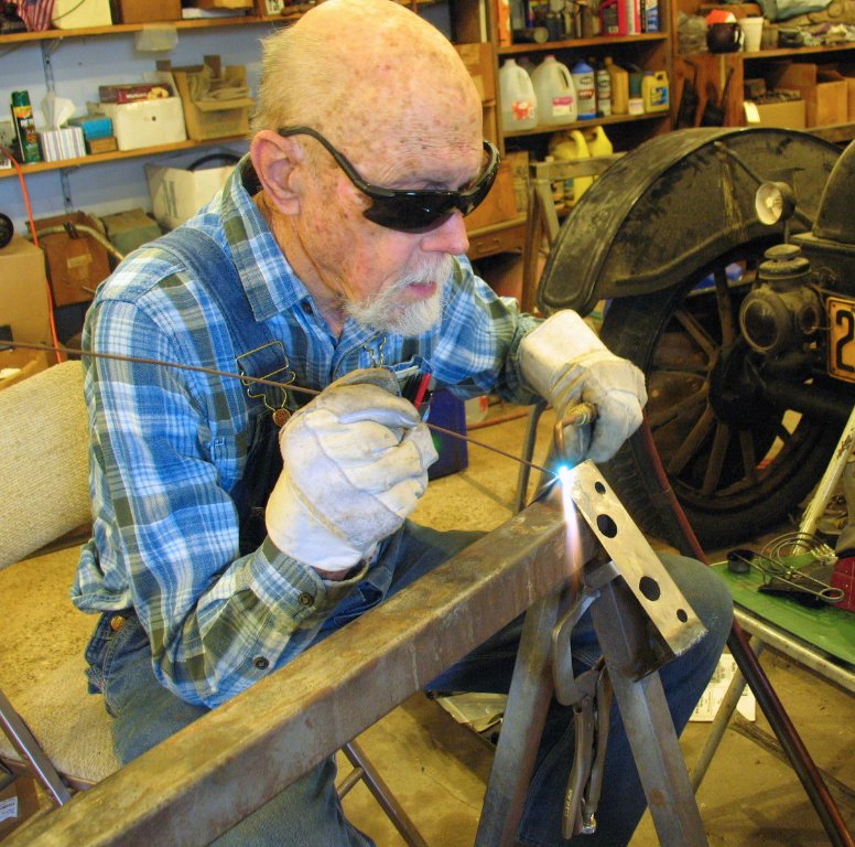 It started out as 3/32" welding rod, and I used it to make blank hangers when I had the sign business, and now it's welding rod again. This is such thin metal that I'm using a 000 tip. I used to watch a couple of my uncles do this kind of welding. I went to work with Lester when he was teaching welding at Chilocco in 1949. Clarence had a shop in town. He was in both wars. He was 17 when we got into WWI, and it was over before he could go to France. After Pearl Harbor he joined the army again, and taught welding in Hawaii. He was over 40, and the young GI's called him Pops. To get back on topic, Clarence once told me of driving a Model T to town in the spring and letting it follow ruts in the mud like a train going down a track.