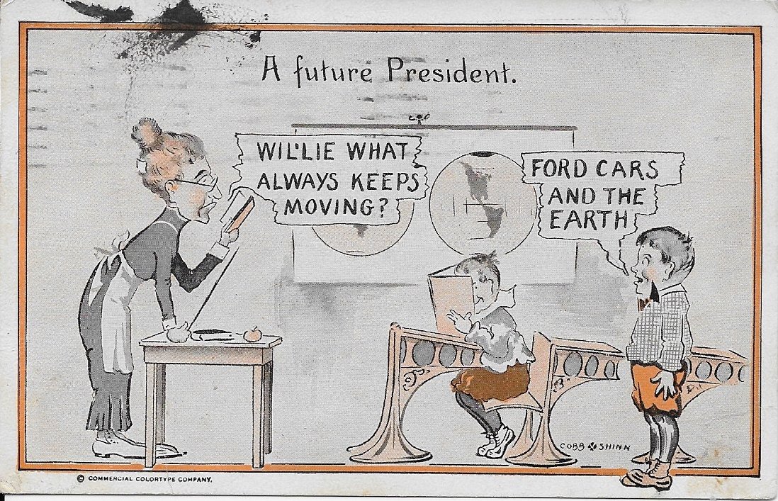 It was about that time that Shinn came to the attention of the Ford Motor Company. It seems that Henry Ford recognized that the jibes at his Model T (first built in 1908) could be turned to his advantage. Shinn began providing humorous cards poking fun at the Model T. Henry Ford is reputed to have said that “every time someone laughs at a joke about the Model T, I sell another car.”"