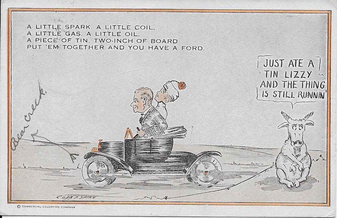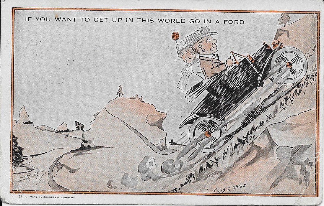 Bryan, the card I posted was from the internet. The difference is interesting. If you do a search of "Cobb Shinn Model T postcard" you will see a variety of color styles.