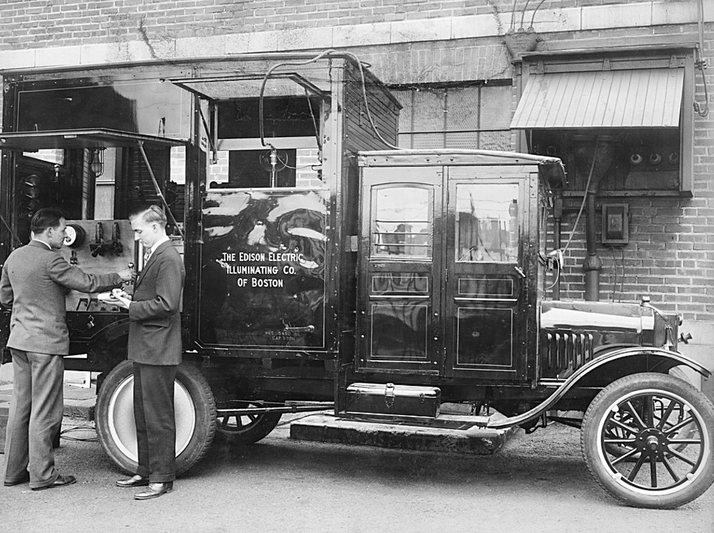 The Edison Electric truck has a telephone hanging from the radiator!