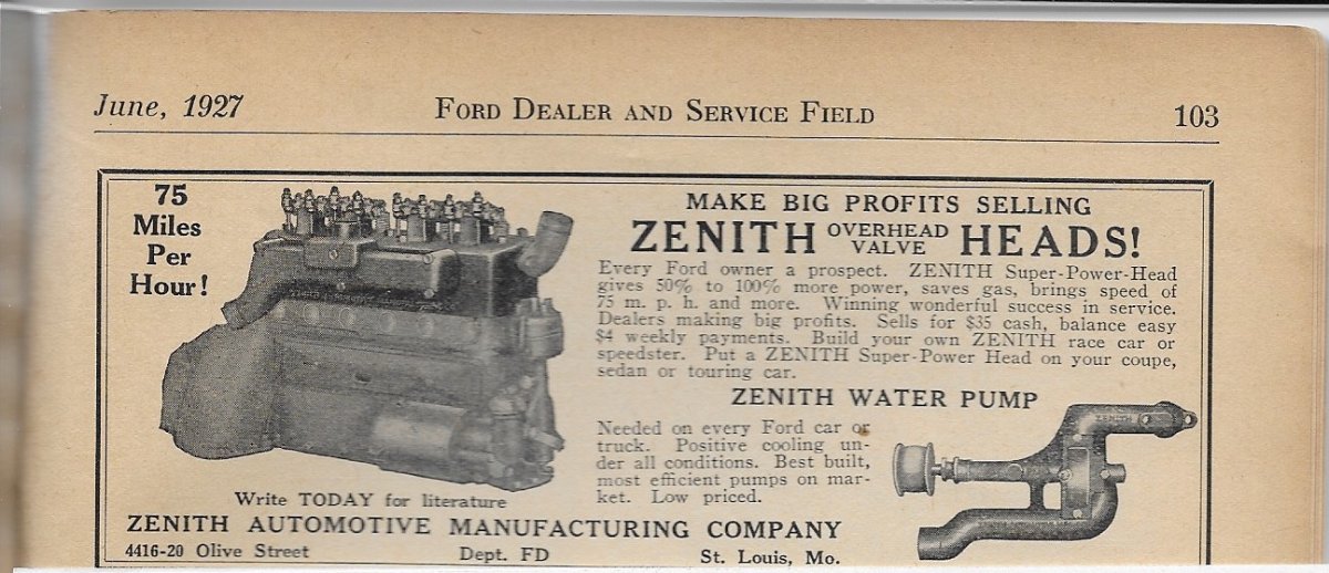 I came across these ads today in "Ford Dealer and Service Field". The first one is from the March 1927 issue. Sorry about the quality of that one. The other two are from April and June of '27. No ads for Zenith appear in any issues prior to March. By November of '27 they weren't advertised. I've never seen one of these heads or remember seeing anything about them on the forum. I wonder if they actually ever reached production. Have any of you seen one of these or have any knowledge of them? It's hard to see, but the first ad makes a claim of 120 miles per hour!