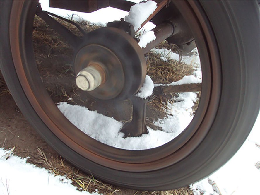"probably V belt running around the drop center wire wheel" The LR wheel is wood spoke, early '26, so likely a v-belt in felloe polishing ends of wood spokes?