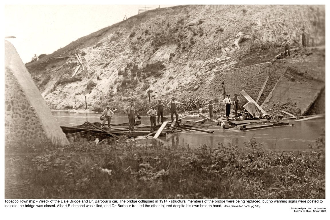 If you enlarge the picture of the bridge collapse by clicking on it, you can read the caption that states one person was killed and Dr Barbour who was also involved in the collapse treated others even with a broken hand. The workmen failed to post the bridge was closed because they were replacing support beams.