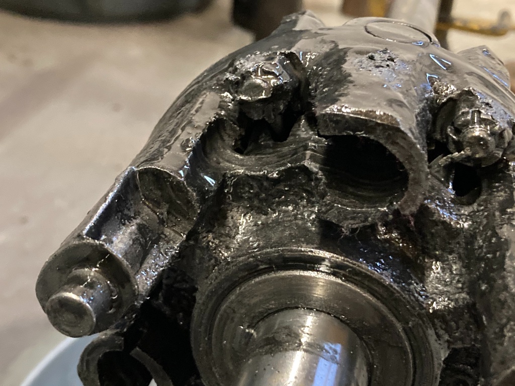 Some people try to calculate the pennies per mile to operate their car... I gave up! This ‘15 touring came to me as a high mileage driver that needed a motor after the bendix cover came loose while driving. We happened to have a mostly done A crank block laying around, so a bit of effort and a few parts and we were back on the road. A couple hundred miles of touring yielded a tire blow out. Sharp rims were the problem! Luckily, I know a guy who can handle building new wire wheels, and so we were back on the road again. Then suddenly, no go! The ring gear falls out in about 10 pieces! Once again, the works; gears, axles, everything! Back to the road for about 150 miles, and something doesn’t feel right...?! Rocking the car back and forth yields almost 1/2 turn of the wheels prior to engaging the motor. A few tests had me hopeful that the tapered roller pinion bearing has slid up the spool causing much backlash in the gears... silly me! Full blown carnage! The Ruxtell gears seized on the pins, pins broke off in the support plate, diff housing completely destroyed, sun and ring gears ground to nubs. Was there oil in it...? YES! Looks more like metallic black paint... but it is/was oil...