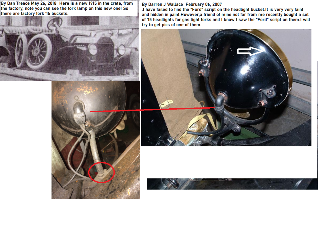 My original 1915 tourer had fork mounted headlights. I have found new homes for a number of fork mounted headlights over the years. I have never seen a Ford script on one. Nor have I ever found one with the flat in the bucket around the bulb socket. Perhaps this indicates just one supplier to the Canadian factory. All have been of the standard dimension, having interchangeable components with later lights.