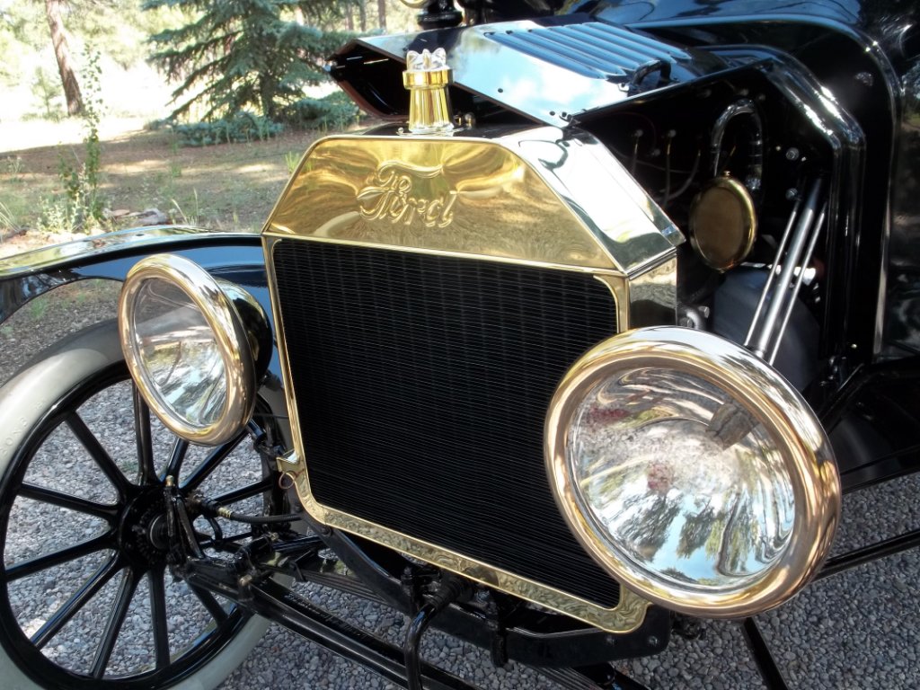 Photo of 1915-style Touring with odd post-mounted electric headlamps, no louvers in the hood, brass steering wheel spider and 1914-type steering gear box