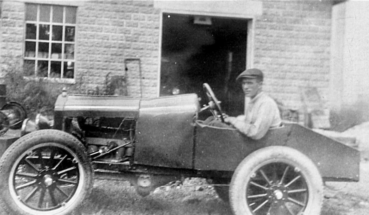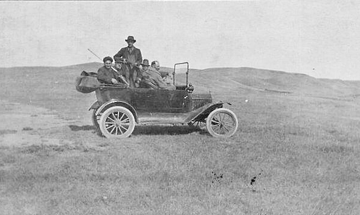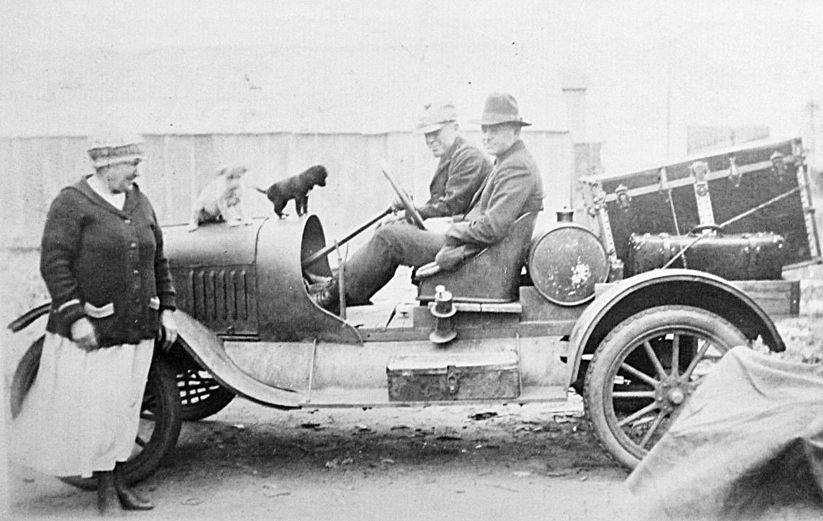 The 1914 with folks on board, one on running board....note the fella hand cranking (proper left hand too).......BUT his lower leg has a white string tied around it.....bet that string is fitted to the camera shutter....he took that photo!