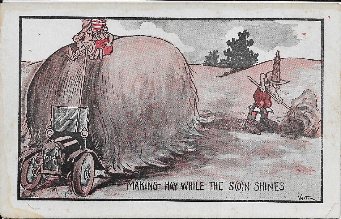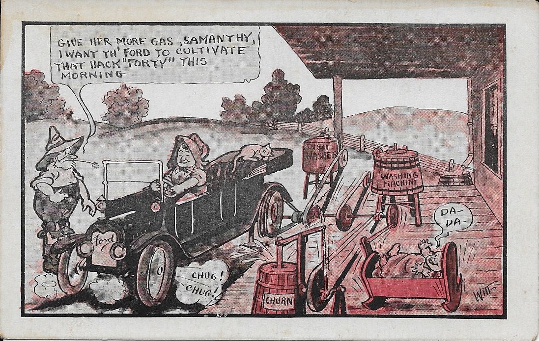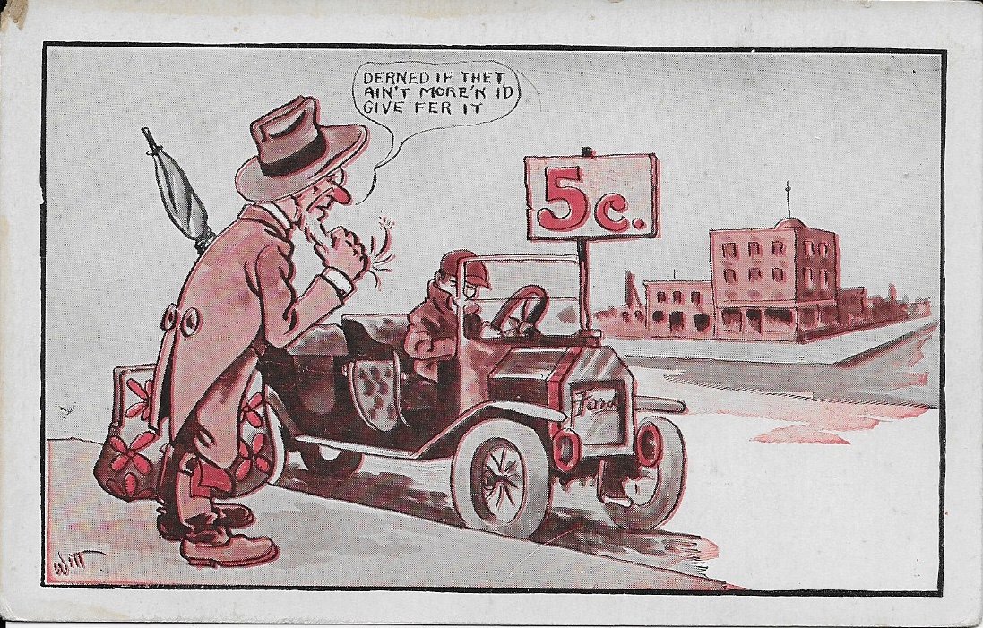 The Model Ts in the Cobb Shinn cards at least resemble Model Ts. These cards as well as the last two styles are all drawn by the artist "Witt". While there are three styles of his cards, all but one that I have that are postmarked are either 1917 or 1918, suggesting they were all drawn about the same time. For whatever the reason, the first series has the Ford besting the big car. The second is poking fun at the Model T and the third is trumpeting the Model T's versatility. Three themes. Three depictions.