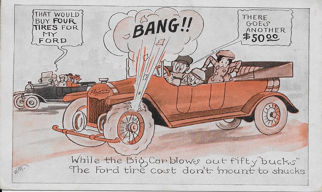 The Model Ts in the Cobb Shinn cards at least resemble Model Ts. These cards as well as the last two styles are all drawn by the artist "Witt". While there are three styles of his cards, all but one that I have that are postmarked are either 1917 or 1918, suggesting they were all drawn about the same time. For whatever the reason, the first series has the Ford besting the big car. The second is poking fun at the Model T and the third is trumpeting the Model T's versatility. Three themes. Three depictions.
