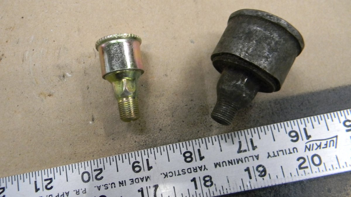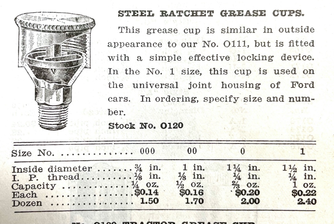 Here is a larger cap size for more grease, it has the 1/8" pipe thread of course. Put one on the steering column bushing too, can't have too much grease on the Ford
