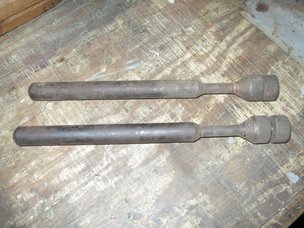 They are 12" in length with the main body being 7/8" in diameter. The shaft between the tapers is 1/2" and there is roughly 2" of space between the tapers. There are no markings anywhere on the pieces as to maker or ID of the tool and they are very nicely made and have a black oxide finish. There are no marks or damage on either one, as if they were ever put into a vise or beaten on, just dirty. Any help that anyone maybe able to offer would be greatly appreciated.