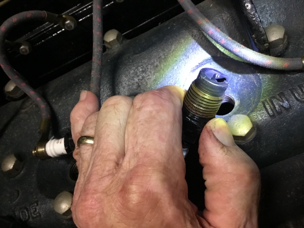 I am changing the oil and flushing the engine with 2 qts. of motor flush. I removed the spark plugs in order to rapidly turn the engine over using the front crank, to mix the motor flush in with the oil before draining and adding the new 10w x 30w detergent oil. While I had the plugs out, I took pictures of the end of the plugs. They all have black carbon on them and a white area at the closest point nearest to the gap. What do you think of the condition of the plugs and what is the best way to clean the plugs of carbon? What is the little white areas and what caused it? The pictures are in order of the cylinders from 1 to 4. Thank you. Jim Patrick