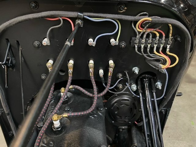 George, The 22 I took apart had four clips on the firewall. Both firewall to frame brackets had a clip behind the top nut, one in the top center at the radiator support rod, and a shallow clip that that attached on the lower driver side coil box bolt to the firewall. That clip was very shallow and only held the magneto wire coming from the coil box mag post through a small hole to the mag post on the hogshead. My after picture has the clip in the wrong location on the horn bracket. Art