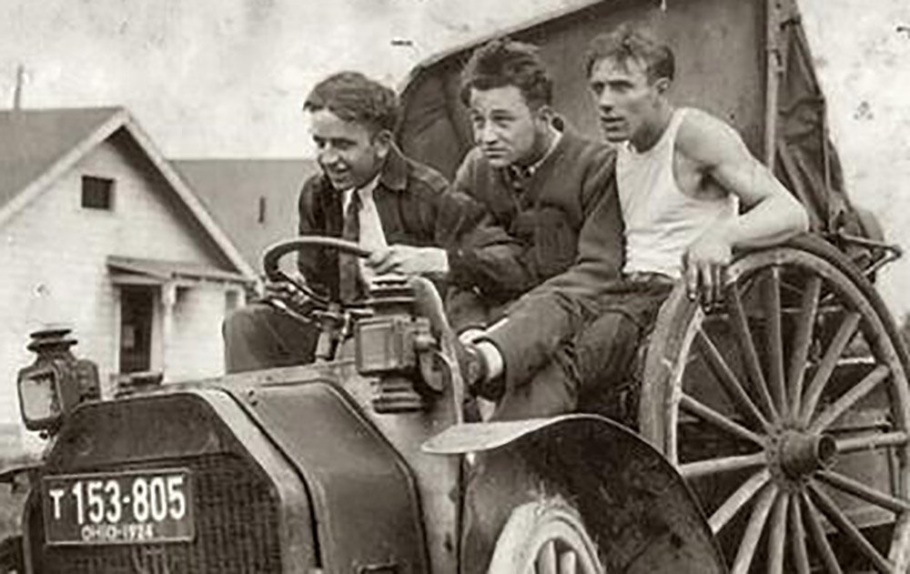 Three guys in an old car